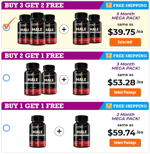 The cost of Hyper XXL 5 bottle pack (Buy 3 Get 2 Free) is $39.75/ea and for 3 bottle (Buy 2 Get 1 Free) pack, it is $53.28/ea. For 2 bottle pack (Buy 1 Get 1 Free), you need to pay only $59.74/ea. The shipping charges are free on all orders. No Hyper XXL coupon code required.