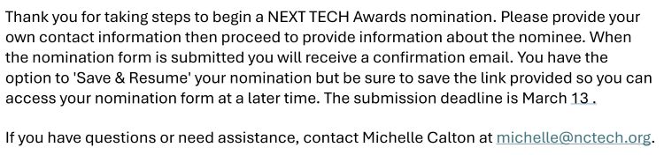 This question should be answered from the perspective of the company’s management team. Consider why you are choosing this individual to receive recognition. Describe what makes the nominee a star performer and a committed team player who goes above and beyond the 9-to-5 by supporting your company, the tech ecosystem, and the greater community. Describe nominee’s professional contributions, how their energy and attitude set them apart and how they make a difference in the community.