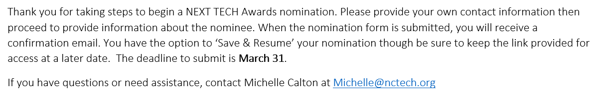 This question should be answered from the perspective of the company’s management team. Consider why you are choosing this individual to receive recognition. Describe what makes the nominee a star performer and a committed team player who goes above and beyond the 9-to-5 by supporting your company, the tech ecosystem, and the greater community.